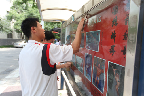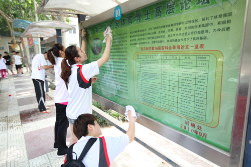 5月18日下午,来自运动训练系08级的40多位学生在辅导员老师马相华带领下,不畏酷热,不怕脏,不怕累,对学院分布各处的60个宣传橱窗进行了义务清洗,携手文明建设,共创美好校园。
