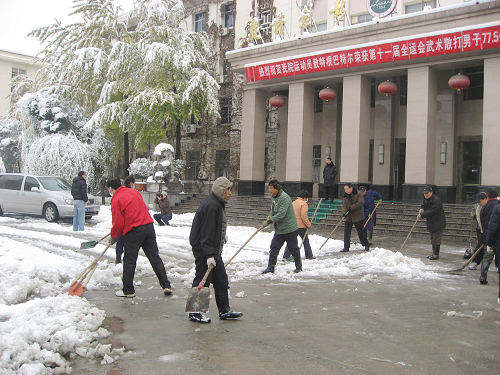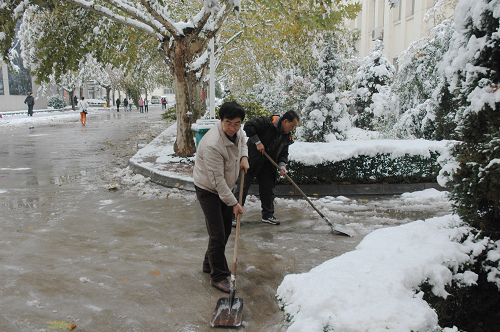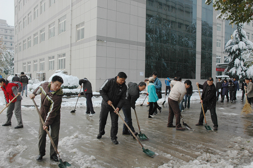 昨晚6时许,西安开始下起暴雪,至今日清晨路面积雪厚度达到十多厘米。虽然这场初冬即至的降雪使各处呈现一派洁白清新的景象,也为大家带来很多乐趣,但同时又给师生们的出行造成不便。我院校园树木较为密集,在一些道路上,往往散落着被积雪压断的树枝,融雪也使路面变得泥泞难走。为了方便人员通行,广大教职员工一大早即自觉投入到热火朝天的铲雪和道路清理行动中来。